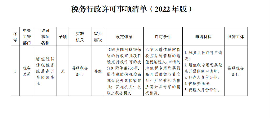 税务行政许可事项清单