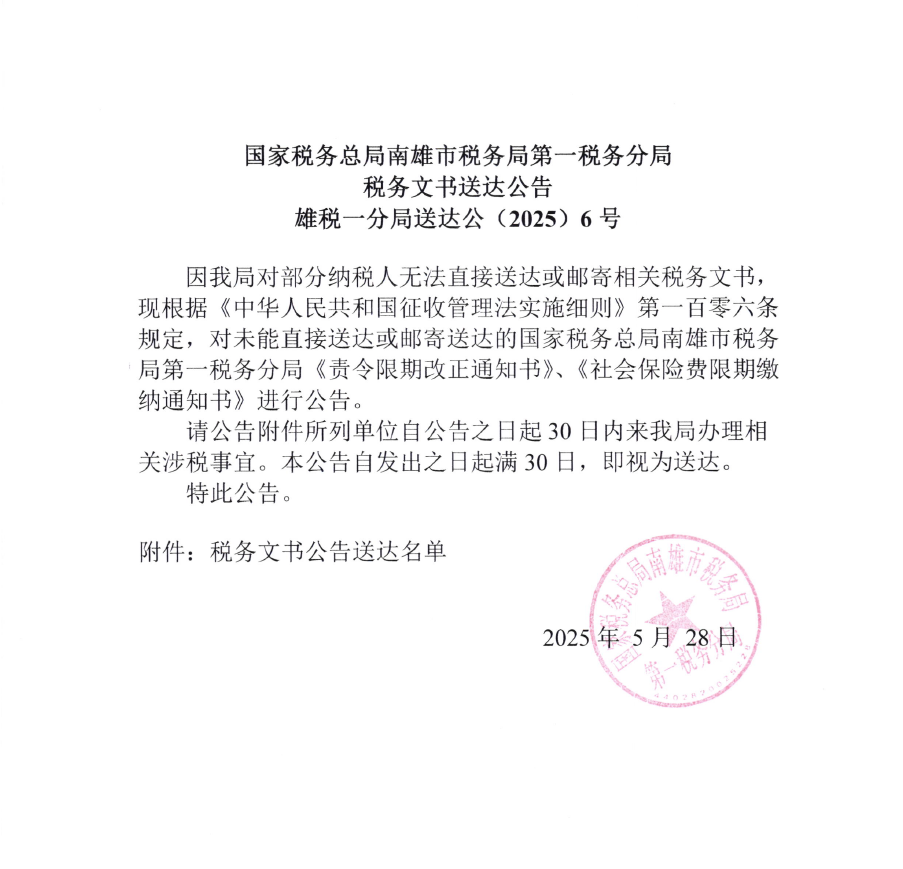 糖心vlog 南雄市税务局第一税务分局税务文书送达公告