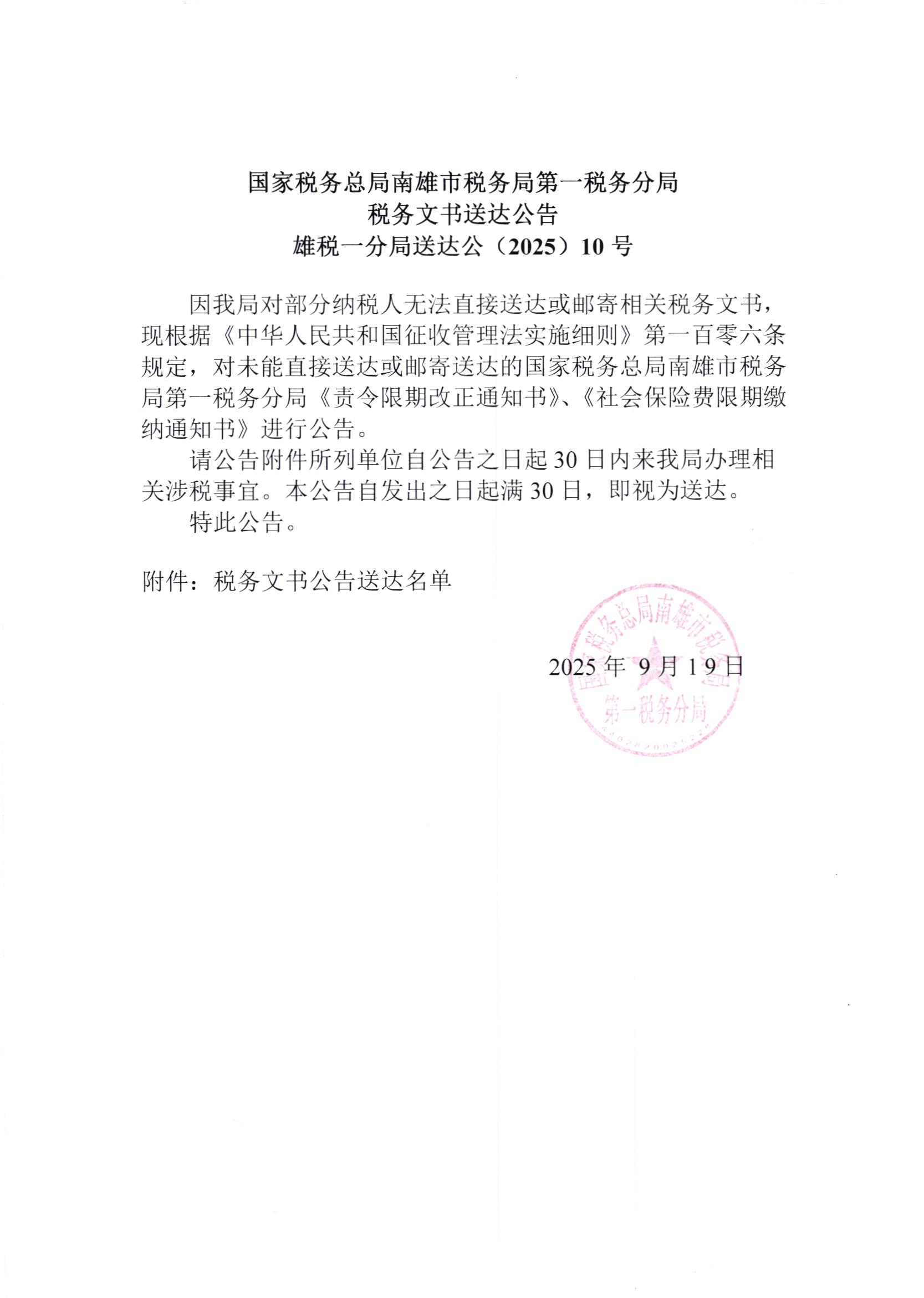 糖心vlog 南雄市税务局第一税务分局税务文书送达公告