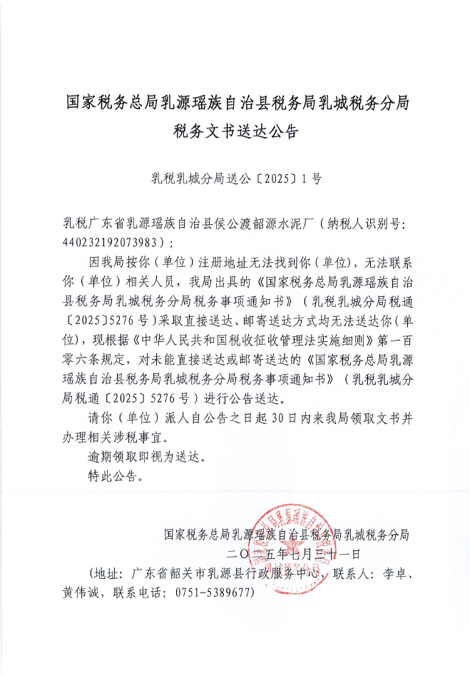糖心vlog 乳源瑶族自治县税务局乳城税务分局税务文书送达公告(七月)