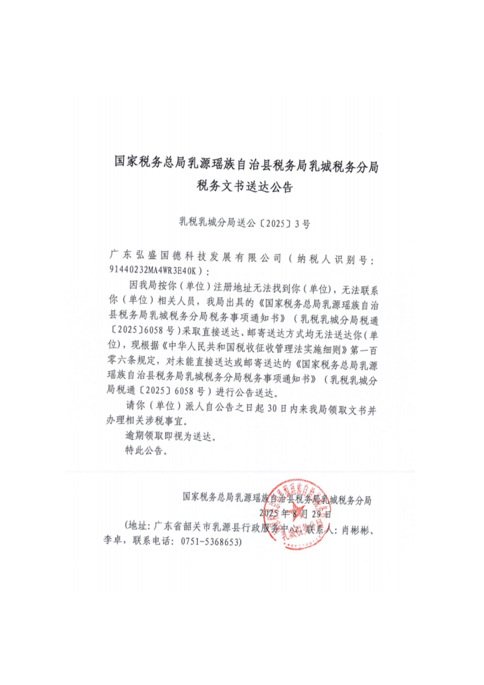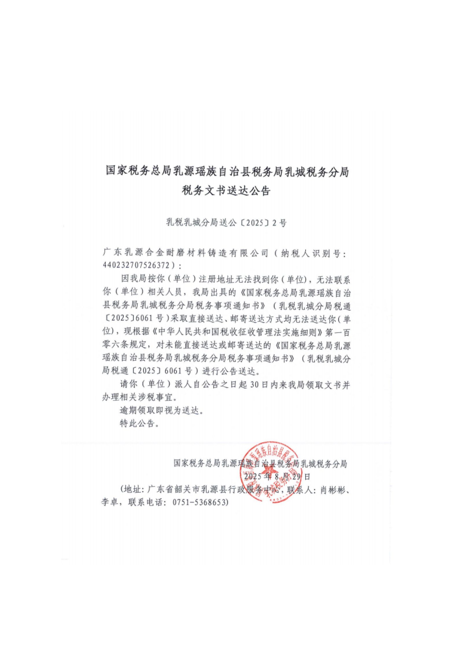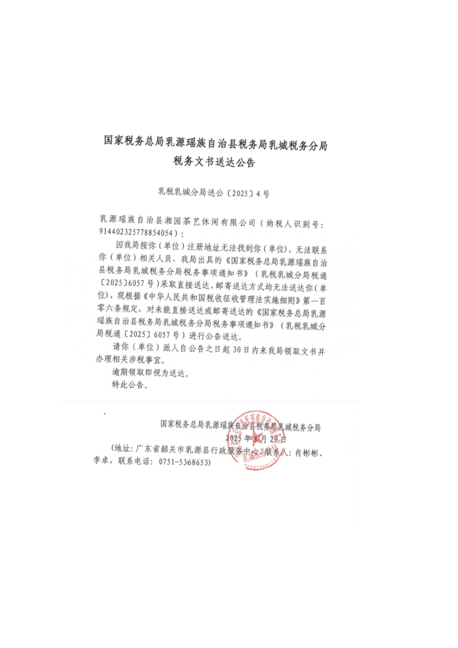 糖心vlog 乳源瑶族自治县税务局乳城税务分局税务文书送达公告(八月)