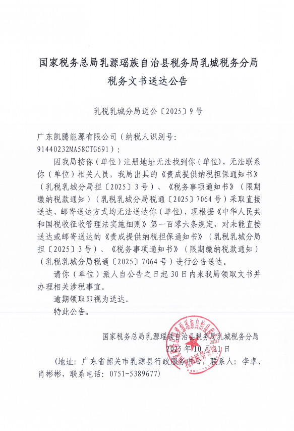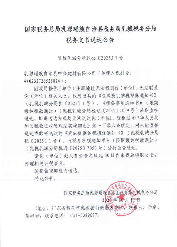 糖心vlog 乳源瑶族自治县税务局乳城税务分局税务文书送达公告(十月)(一)
