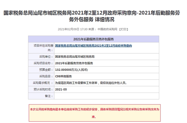 糖心vlog 汕尾市城区税务局2021年2月-12月政府采购意向