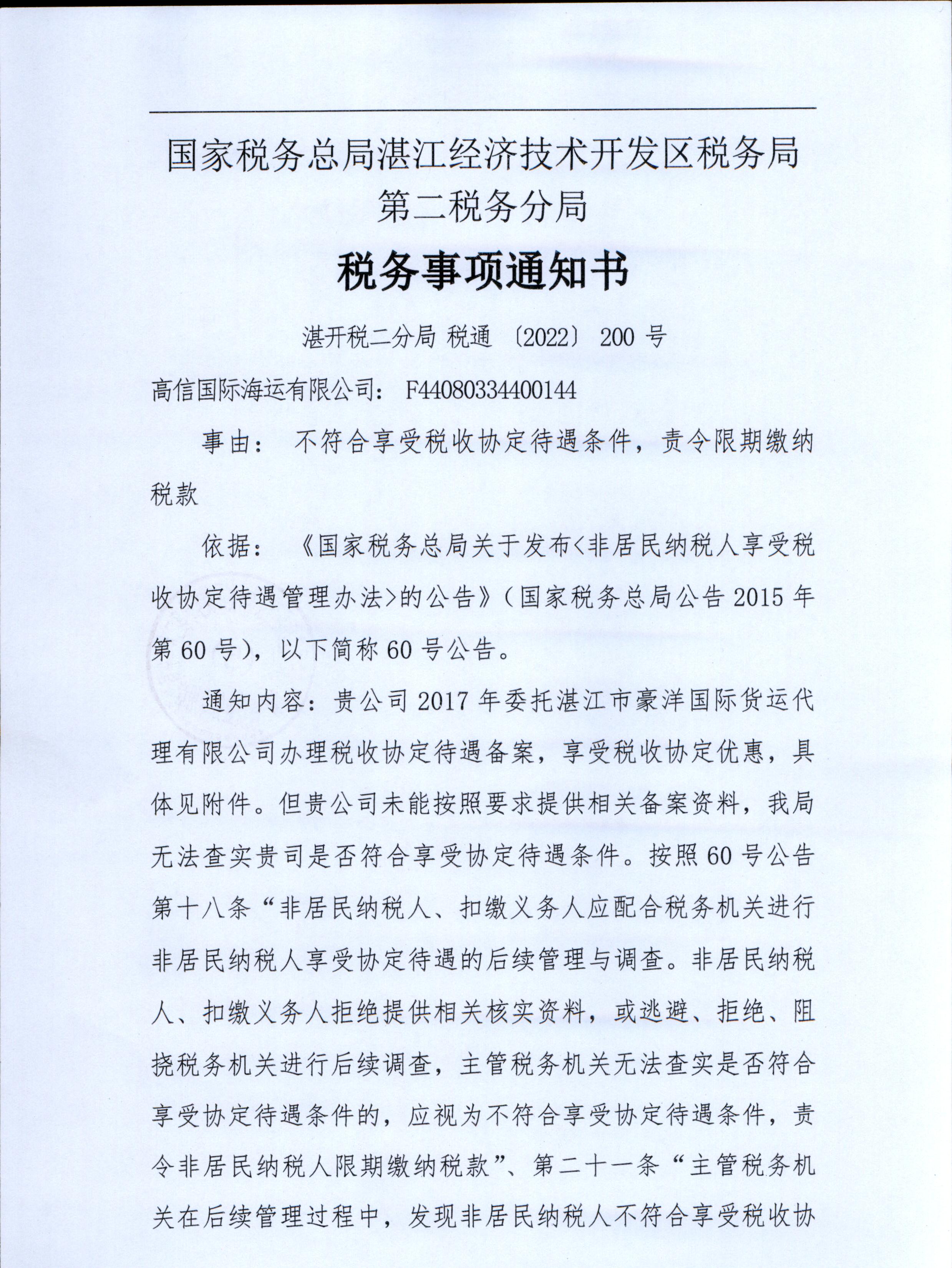 请你单位及时到我局(地址:湛江经济技术开发区乐山路35号银隆广场裙楼四楼)领取《税务事项通知书》(湛开税二分局 税通〔2022〕200号)正本,否则,自公告之日起满30日,上述《税务事项通知书》(湛开税二分局 税通〔2022〕200号)正本即视为送达。