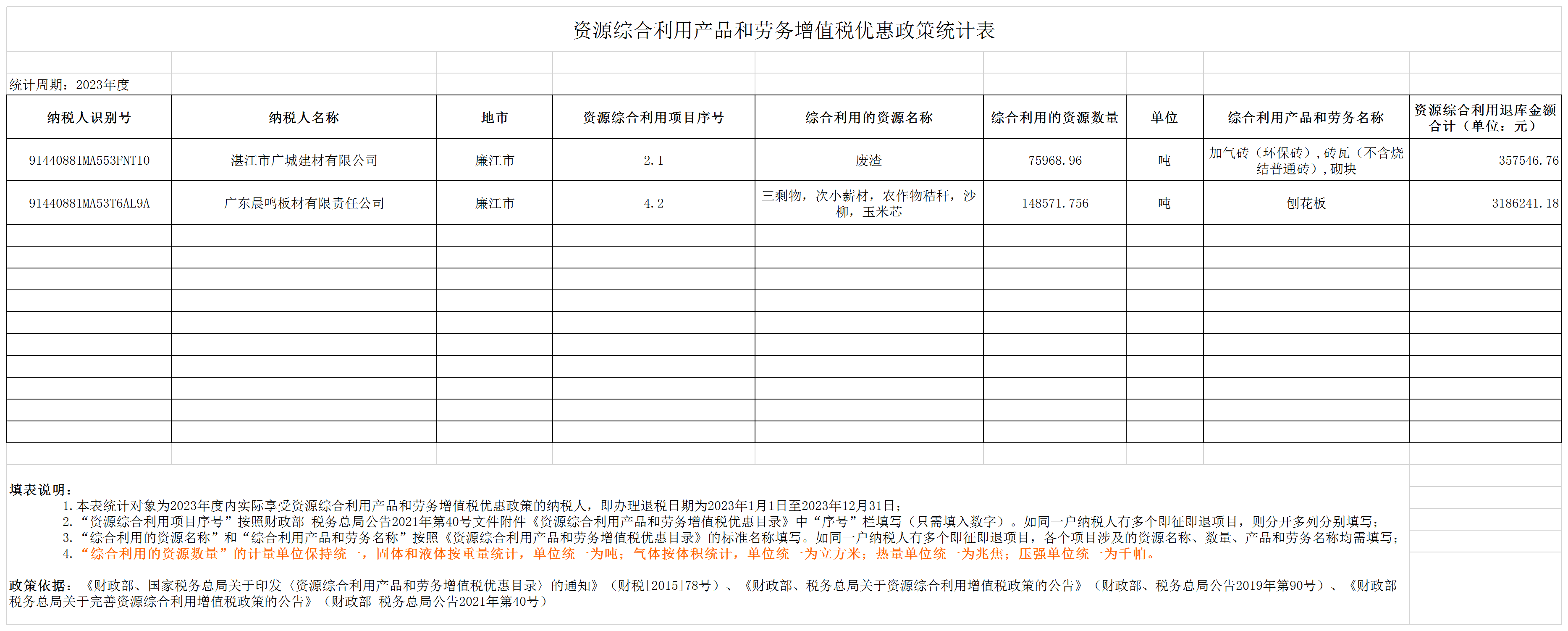 2023年度享受促进资源综合利用产品和劳务增值税税收优惠纳税人情况