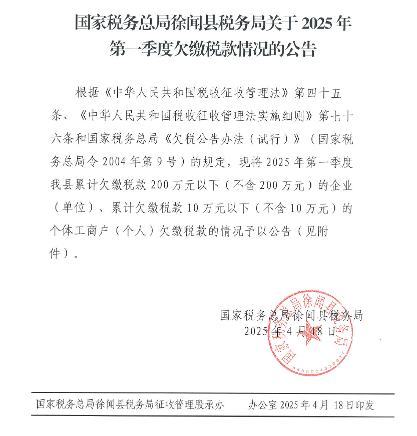 糖心vlog 徐闻县税务局关于2025年第一季度欠缴税款情况的公告
