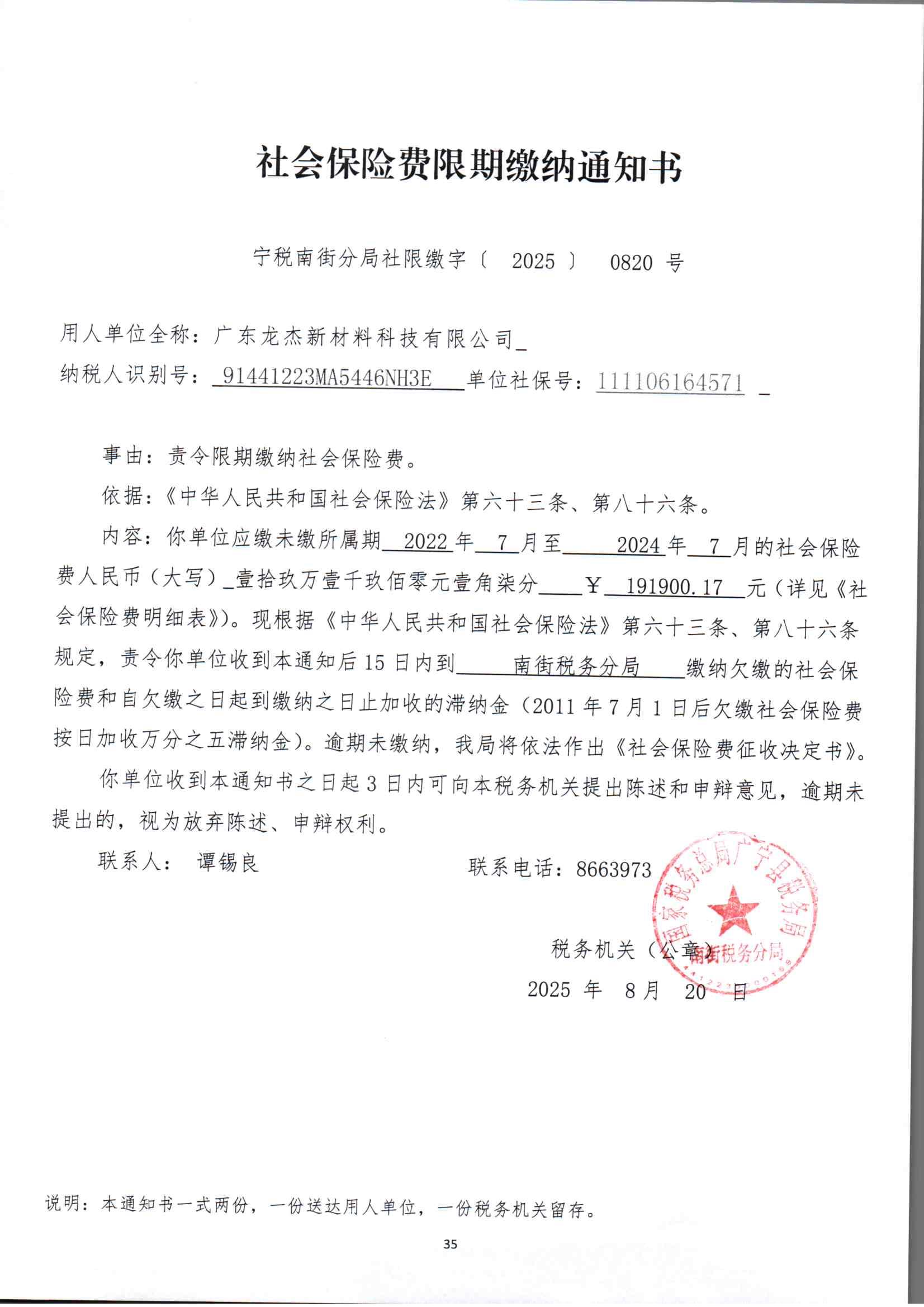 附件:《社会保险费限期缴纳通知书》(宁税南街分局社限缴通〔2025〕0820号)